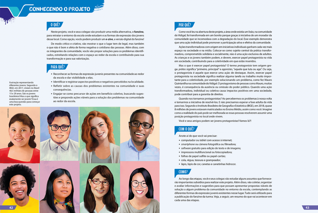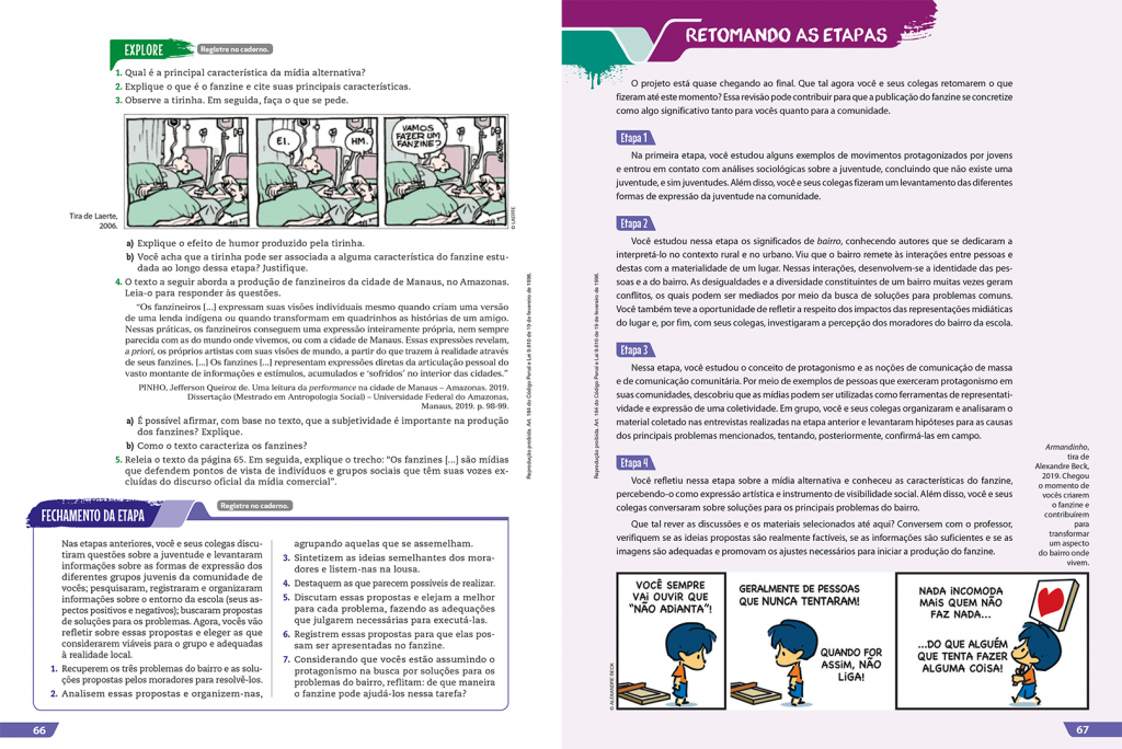 - Na seção “Retomando as etapas” os alunos têm a oportunidade de revisar o que fizeram antes de avançarem para finalização e produção do projeto.